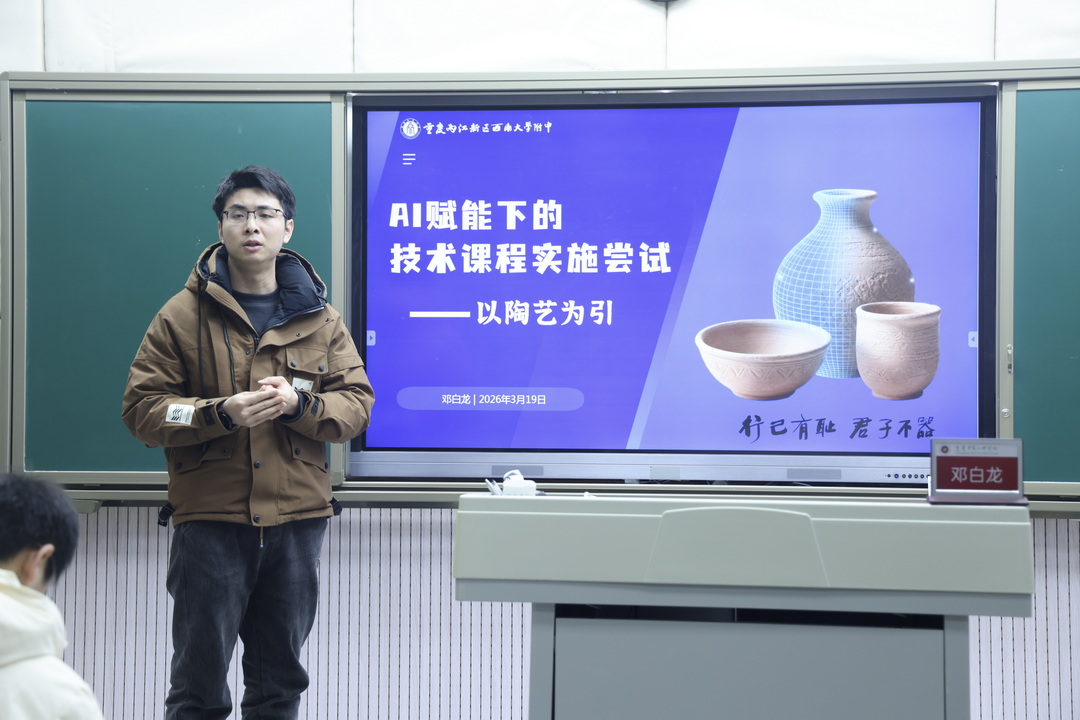 随后两江新区西南大学附中技术组教师邓白龙以《AI赋能下的技术课程实施》为主题,重庆八中技术与工程教研组长郭茂以《技术赋能、工程筑基》为主题,重庆一中寄宿学校技术组教师、中学信息科技兼职教研员张元立以《数据驱动的技术学科“备教学评”一体化教学实践》为主题分别展开分享。邓白龙老师以陶艺课堂为例,分享了AI赋能技术课程实施的创新路径,核心围绕沉浸式体验、精准化示范、个性化辅导、智能化评价四大环节,将传统陶艺与人工智能深度融合;郭茂老师分享了重庆八中技术教研组在教学课程建设、教学实施开展、教学评价体系三方面的系统化实践,重点围绕技术与工程学科核心素养,构建了一套可落地、可推广的校本教研与教学体系,并对相关教学成果进行了全面展示;张元立老师围绕数据让备课有据、数据让教学有方、数据让教学有痕、数据让评价有力,系统分享了AI技术在技术学科“备教学评”一体化中的深度实践,以数据驱动实现教学全过程精准化、智能化、可视化。