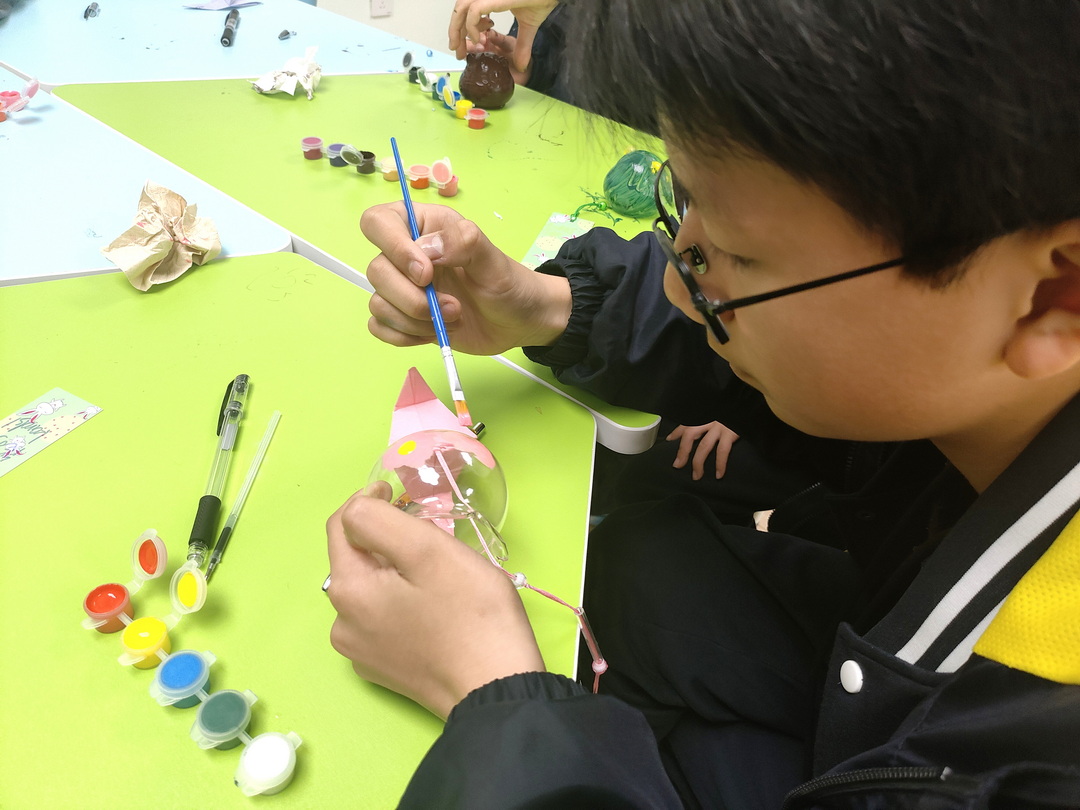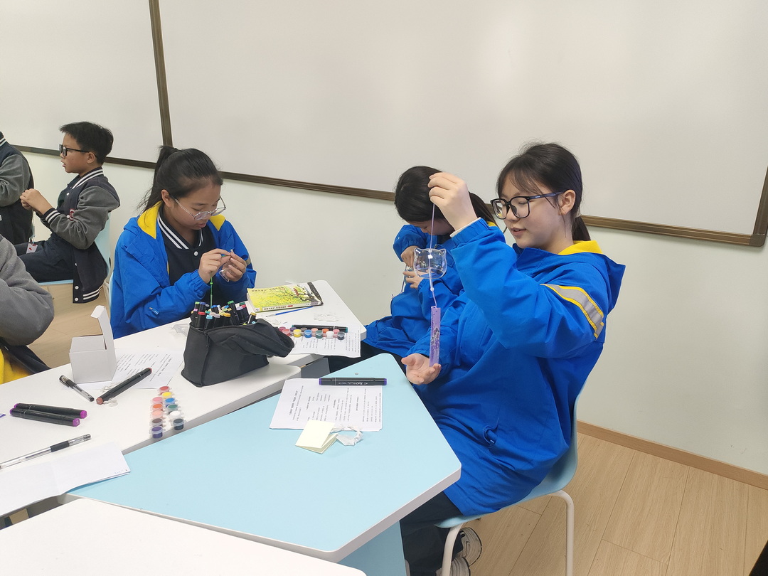 在核心创作环节,学生依次完成了“心情风铃”的各个部分。他们首先在长条形卡片上写下自己曾经历的积极情绪体验,将温暖的记忆转化为可视化的文字;随后,在谢老师的现场演示与同伴互助中,学生们折叠出一只只小巧的千纸鹤,承载着新学期的心愿与期许。最后,学生在透明的玻璃罩上自由绘制代表“开心与幸福”的图案——太阳、云朵、笑脸、问号……每一笔都是内心情绪的具身表达。所有的作品通过细绳串联成风铃,成为“独立个体,共同发声”的象征。