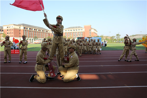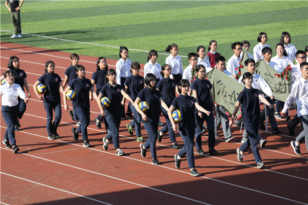 本次运动会开幕式主题为“年代秀”,从充满民国记忆的二三十年代,到科技创新发展的当下,同学们大开脑洞,给观众们带来精彩纷呈的开幕演出。初一的同学们人小志大,抗日救国的《黄河大合唱》在这里唱响,身着民国服装的师生在这里摇旗呐喊,声声朗诵传递出爱国情怀……初二年级的同学们相聚在一起,歌唱《我们的生活充满阳光》,《在北京的金山上》舞蹈出人民对共产党、对祖国的热爱,随后大家穿越到现代,共同跳起“海草舞”,欢动全场。高一的班级方阵用他们的精彩表演一次次唤起观众的记忆。香港回归的升旗降旗仪式重现,点燃全场,重庆直辖的标语引得阵阵掌声……同学们诚挚的祝福与创意,让在场的所有人为之震撼。