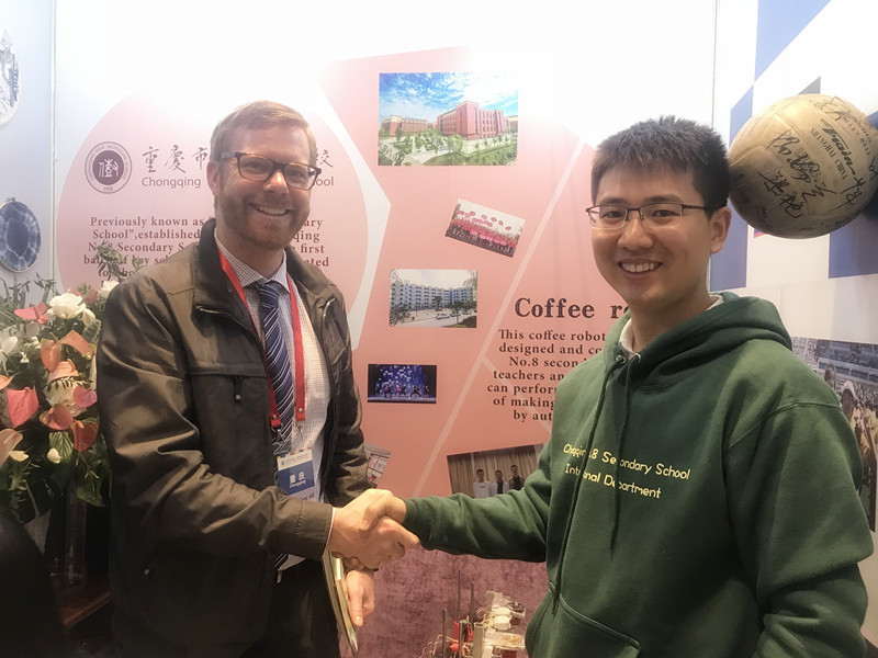 11月6日下午,“中美基础教育风采展示会”在重庆南开中学科技馆热闹举行。展示会上,美方7个州的22所学校和来自重庆7个区的26所中小学将分区各自展示自己学校的特色和风采,展示内容丰富多样、趣味十足,全方位展示学校的校园风貌、办学理念、教师风采和学生风采。其中,重庆八中国际部的同学和老师们热情主动,用流利地英语想美国来访团介绍八中,推过光中国文化,展示自我风采。重庆八中付英校长亲临现场,面对面与美国校方进行深入交流。