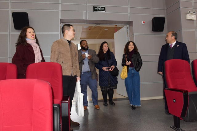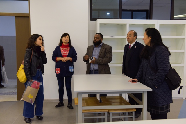 两位美方代表首先在重庆八中国际部周荧主任的陪同带领下参观了重庆八中渝北校区校史馆以及艺术厅。