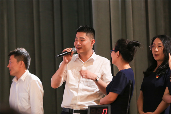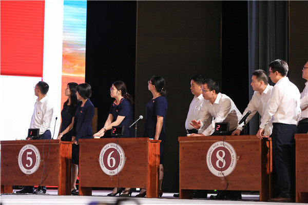 庆祝大会在《没有共产党就没有新中国》的歌声中拉开序幕。随后备受瞩目的“党性知识竞赛”正式开始,竞赛试题内容涉及习近平总书记十九大报告原文、习近平总书记两会期间参加重庆代表团审议的重要讲话和重庆八中80周年校庆历史知识回顾,共分成“单兵直击”“激流勇进”“心有灵犀”“铁肩担当”“集团作战”五个部分。本次比赛分支部组成9支参赛队伍,并采用电脑随机从全体党员中抽签的方式确定参赛队员。本次知识竞赛以我校党委一年来开展的一系列政治学习为基础,引起全校党员广泛参与,尤其是“心有灵犀”环节,更是激发了全体党员的参与热情,掀起竞赛的高潮。