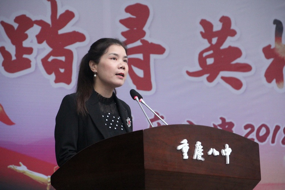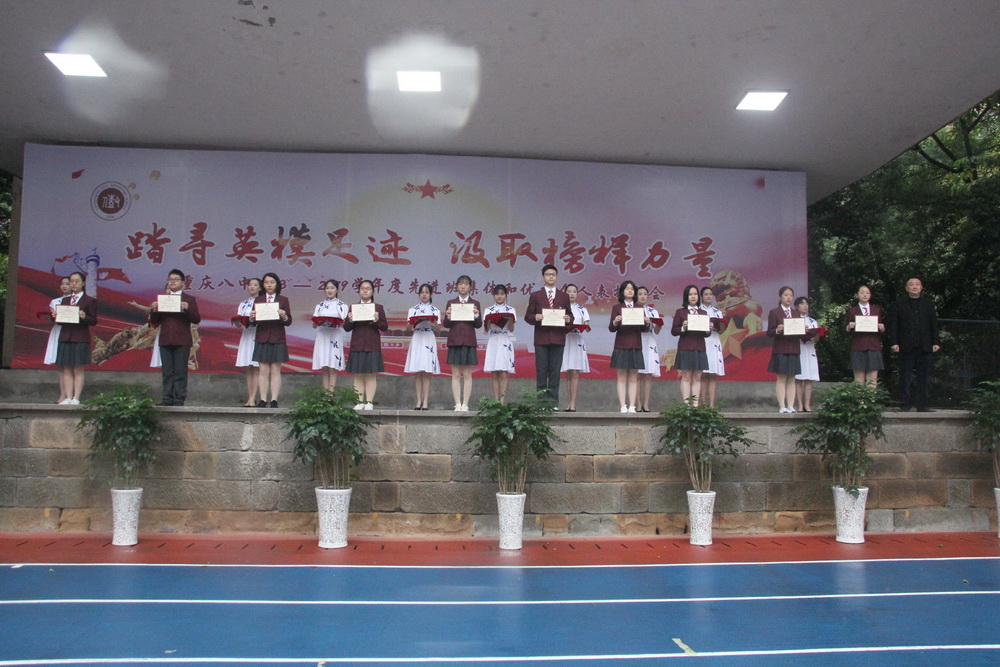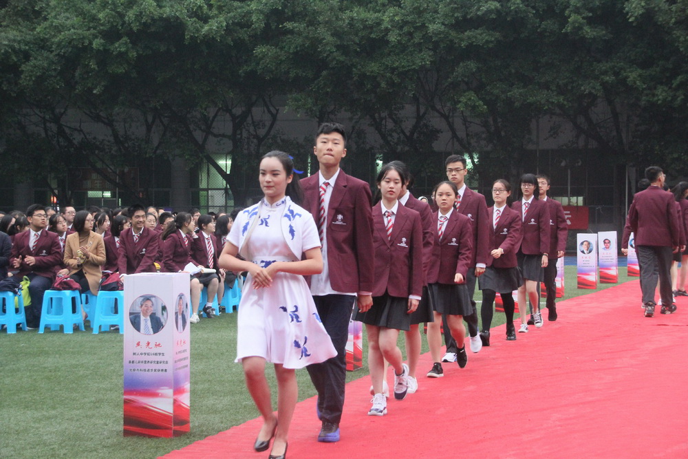校长周迎春、党委书记卿知人、副校长杨华、副校长付英、副校长梅家烨分别代表学校宣读先进班集体、八中之星、熊榆争光奖、优秀学生干部等8个类别的奖项颁奖词。在热烈的掌声中,获得优秀学生干部、熊榆争光奖、八中之星荣誉的学生及获得先进班集体荣誉的班主任走上红毯,陆续登台接受领导老师的颁奖、献花和同学们的祝贺。