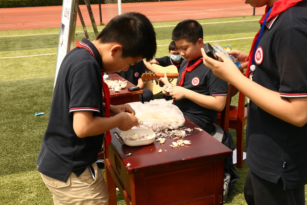 活动在渝北校区的大操场上举行,初2023级全体师生都参与其中。天空阳光正好,蓝天的光彩掩映在同学们的笑脸上。本次创意集市由游园会和创意集市两方面组成,十五个班级摇身一变成十五个充满创意的店铺:有与生活息息相关的定时叠衬衣、定时缝扣子、定时剥大蒜等挑战,有垃圾分类、分黄豆绿豆、算账等生活技能的游戏,还有猜灯谜(与劳动有关)、梳辫子、还原收纳等提升生活情趣的活动。每一个班级的活动都将生活中的劳动场景与游戏挑战相结合,让同学们在欢笑中更多地领悟生活,品味生活。
