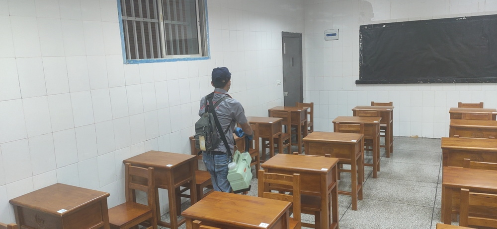 6月7日,结束第一天考试后隆福环境管理有限公司“爱心护航,健康高考”为八中每间考室及周边环境进行消毒、灭杀蚊蝇,并按规定进行通风,确保“健康高考”。