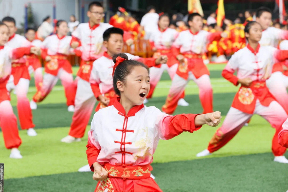 赛中,同学们服装统一、队伍整齐、精神抖擞、口令响亮,成为操场上一道道亮丽的风景线。各班入场式也是炫丽缤纷,舞龙舞狮、现场书法、鼓上起“武”,为开场铆足了气势。随着《功夫青春》武术操音乐的响起,开步冲拳、转身虎爪、提膝拍挡、马步挂肘、弓步撑掌……学生们动作整齐标准、节奏分明、出拳刚劲有力、踢腿虎虎生风,俨然一个个“江湖高手”,充分展现出了当代青少年的精神气。