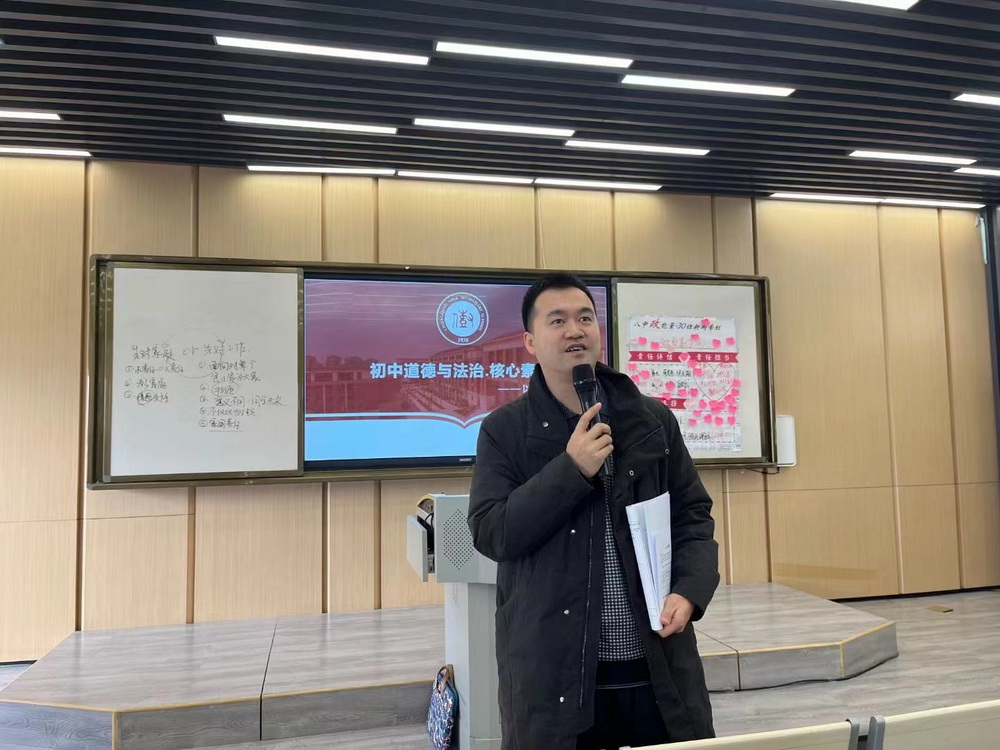 授课结束后,共有四位老师进行了评课,之后并以初中道德与法治·核心素养——以中考命题为例进行了教学研讨。首先进行评课的是吴朋阳老师,他从学科核心素养对陈阳老师的课进行了针对性的点评。他认为陈老师的课素材案例、视频材料有利于激发学生的政治认同;学生活动尤其是辩论环节有利于训练学生的辩证思维,落实科学精神;学生活动真实有效有利于落实学生公共参与。接下来马锦康老师以有思想、懂政治、会思考为题进行了主题点评,他认为陈老师的课是一堂结构完整、层层递进的课,是一堂节奏明快、活动有效的课,是一堂让学科核心素养落地生根的课,马老师还就课堂设问预设和生成进行了思考,如果老师提出的问题,学生都能答上来,抛开学生素质因素,这样的课堂是不是合适的引发大家深思。然后邹玉老师对陈老师的课进行了总结,提出了建议,她认为课堂中应该教会学生如何分清轻重缓急,教会学生生活的智慧。最后高瑜老师从精准设问、辩论情景设置两方面对陈老师的课进行了点评,并分享了“用好时政新材料、研好各学段教科书”的经验,从而启迪大家要增强思政课教师的时政敏锐感、教材研读度。