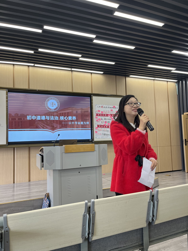 在四位老师们的深刻点评后,初中教研组长尹晓晴老师就初中道德与法治·核心素养——以中考命题为例进行了微分享。尹老师提出初中道德与法治课应该把握时代脉搏,促进政治认同;直面生活情景、涵养科学精神;强化问题导向,提升法治意识;培养实践思维,引导公共参与。