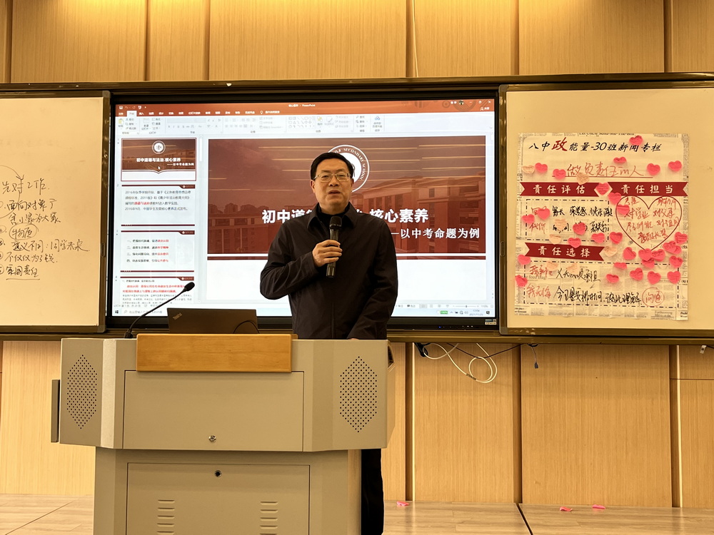 2021年11月25日上午9时许,重庆市第八中学校2021—2022学年度青年教师课堂教学大赛文科组决赛的第二场比赛在重庆八中宏帆初级中学校第三阶梯教室顺利举行。比赛受到了学校的高度重视,重庆八中党委书记卿知人老师、党委副书记王怒涛老师莅临比赛现场,参与本次活动的人员还包括重庆八中全体政治教师及相关评委老师。本次活动由重庆市第八中学校初中政治教研组长尹晓晴老师主持。