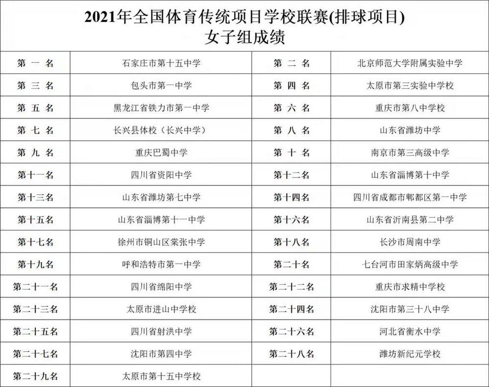 重庆八中女子排球队获2021年全国体育项目传统学校排球联赛第六名