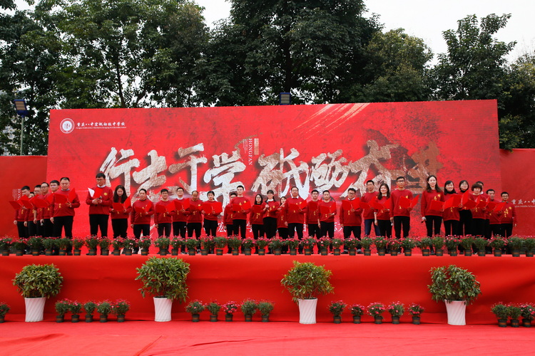 第三个篇章“圆志于学,奔向未来”,重庆八中宏帆中学校长郝永宁铿锵有力的演讲《最是一年春好处,志学奋进正当时》感染了在座的每一个人。她寄语同学们立志创造属于自己的奋斗奇迹,立志拥有独立的思想和高贵的人格,向阳生长,志学奋斗,青春无悔。在见证一百天的重要日子里,重庆八中校长周迎春和党委书记卿知人书记为宏帆初2022级揭“志学”牌,年级主任黄江林和支部书记赵宇红接牌。揭牌后,12班赵萱懿同学带领同学们喊出十五岁的誓言。“三载峥嵘,一心学海遨游;今朝圆梦,无悔书山攀登。”全体学生铮铮的誓言响彻云霄。醒狮队的表演让整个活动又进入了一个小高潮。“旗开得胜,金榜题名;蟾宫折桂,前程似锦。”表达了全体教师对同学们的美好祝愿。最后,在祝炯、姚浪和28班彭森科、24班姜力畅 、16班陈思含、31 余彦辰几位同学的领唱,全体同学的大合唱《骄傲的少年》中,这次活动到达了最高潮。