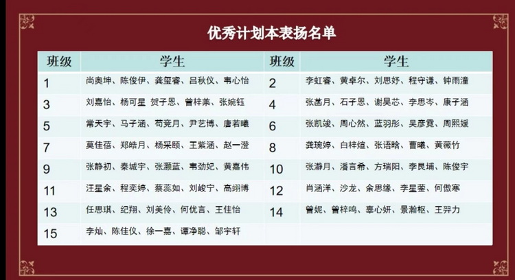 活动开展前期,由班主任老师、各学科老师在班级评选出5名优秀计划本名单和学科作业笔记,主要包括优秀改错本、资料整理、课堂笔记等内容,同时提供3份优秀作品。年级将学生名单、作品汇总,安排学科教师线上点评学生作品,传授笔记、资料的整理方法。最终将内容合成视频在年级统一播放表扬。