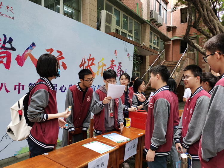 为进一步营造校园心理健康教育氛围,培养学生积极关注心理健康的意识,2022年5月16日至5月20日,重庆八中沙坪坝校区开展了为期一周的心理健康教育活动。在校学生处等部门的大力支持下,学生会、团委、社团联合会成员的全力组织下,心理健康知识宣传展及心理知识现场问答、现场心理测验、友谊驿站等一系列活动与同学们见面。