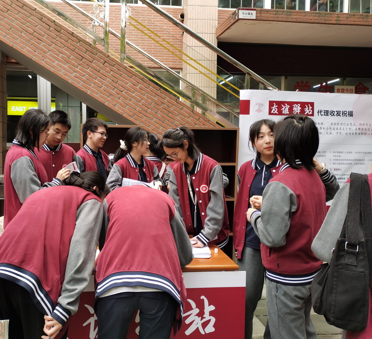 围绕“和谐人际 快乐青春”的主题,本次活动周特意新增“友谊驿站”环节,由团学联的成员为参与的同学们传送别有意义的礼物。同学们可以选择实名或匿名为对方送去珍贵的祝福或饱含新意的小礼物,其中许多同学借此机会贴心地为即将高考的高三同学送去祝福。在校门入口,学生处也专门设置祝福墙,留下便利贴,方便全校师生在祝福墙上写下对高三同学的祝福;在校园公共通道的两侧,也摆放着许多励志鼓舞的话语立牌,为高三学子以及全校师生加油助威。