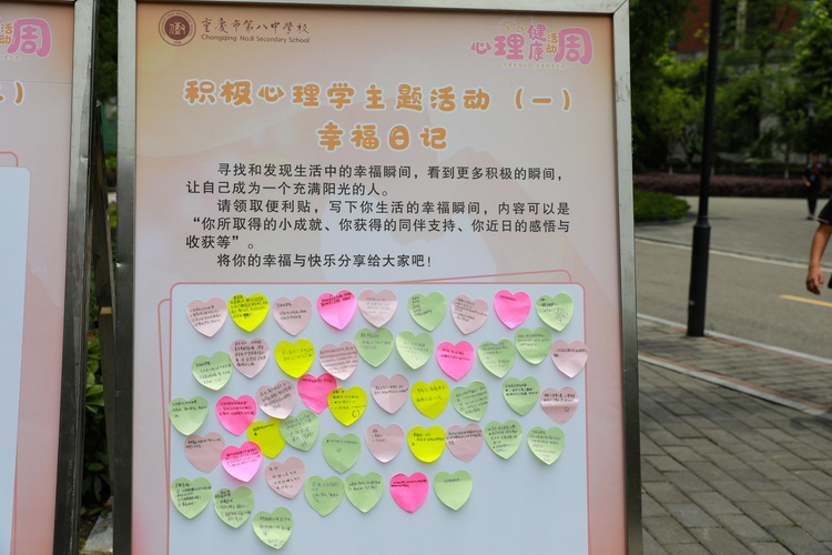 2022年5月末,迎着初夏温暖而明亮的阳光,重庆八中(渝北校区)开展了以“心向阳光,温暖你我”为主题的心理健康节活动。在学校学生处等部门的大力支持下,心理健康知识宣传展、现场心理辅导、现场心理测验,以及“积极心理学”主题活动等一系列活动顺利开展。