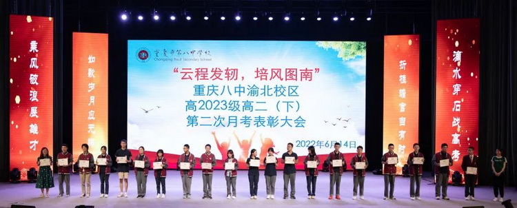 辛勤汗水,换来丰硕成果。经过学校严谨有序的组织,经过全体师生的共同努力,第二次月考已圆满结束。这次月考,是对同学们的学习态度、学习作风、学习效果、学习经验、学习方法的检查和总结。为了鼓励先进,鼓舞斗志,为了帮助同学们更好分析考试得失,掌握科学的学习方法,以更加饱满的精神状态投入到下一阶段的学习任务中,6月14日晚上,重庆八中渝北校区高2023级师生们齐聚一堂,隆重召开“第二次月考表彰大会”,对积极努力、刻苦学习、在月考中取得优秀成绩和显著进步的同学进行表彰。