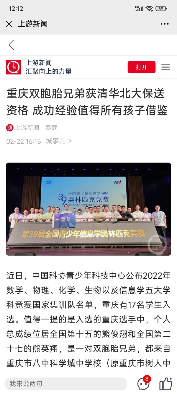 上游新闻——重庆双胞胎兄弟获清华北大保送资格,成功经验值得所有孩子借鉴