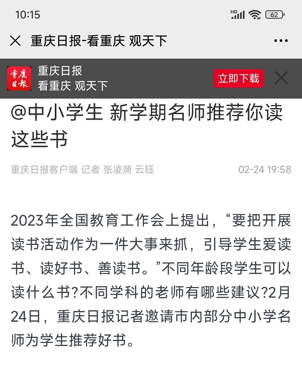 2023年全国教育工作会上提出,“要把开展读书活动作为一件大事来抓,引导学生爱读书、读好书、善读书。”不同年龄段学生可以读什么书?不同学科的老师有哪些建议?2月24日,重庆日报记者邀请市内部分中小学名师为学生推荐好书。