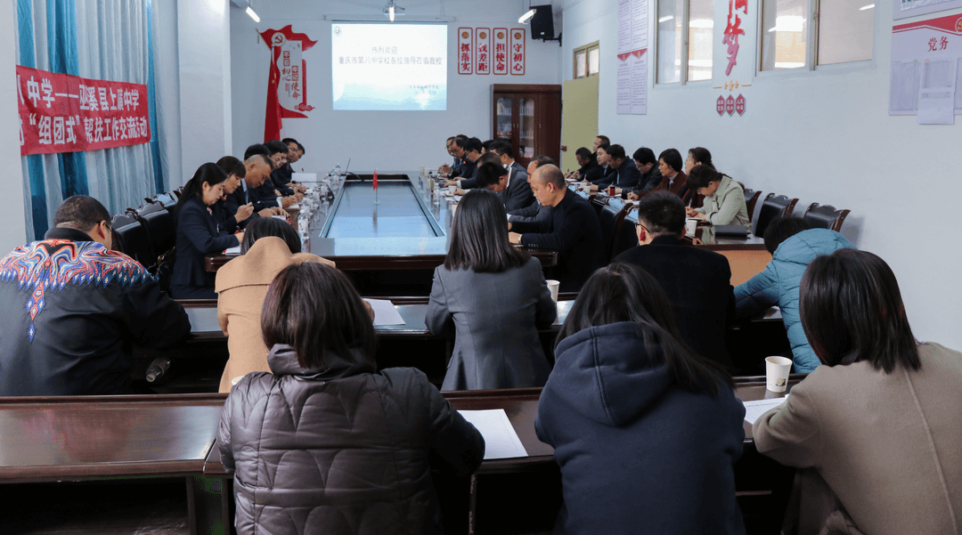 下午16点30分,重庆市第八中学校校长周迎春、党委书记卿知人、党委副书记王怒涛、重庆市第八中学校帮扶团队、重庆市渝中区支教教师,山东省泰安市帮扶团队、山东省肥城市支教教师,巫溪上磺中学校党支部书记郑昌奎、校长夏昕宇等管理团队成员、教研团队成员在求真楼五楼参加交流活动。活动由上磺中学副校长张代华主持。