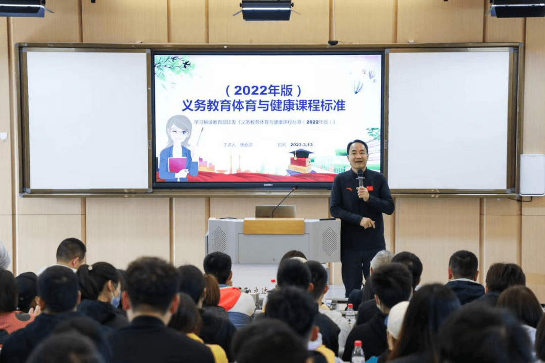 随后,江北区教研员唐嘉滨老师带领全体教师一起深入解读“义务教育体育与健康课程标准”的会议精神,指出学校体育在教育教学中的重要性,没有体育不成教育,希望在体育课堂做好课堂趣味性和活动实施有效性,让学生喜欢体育课,上好每一节体育课。