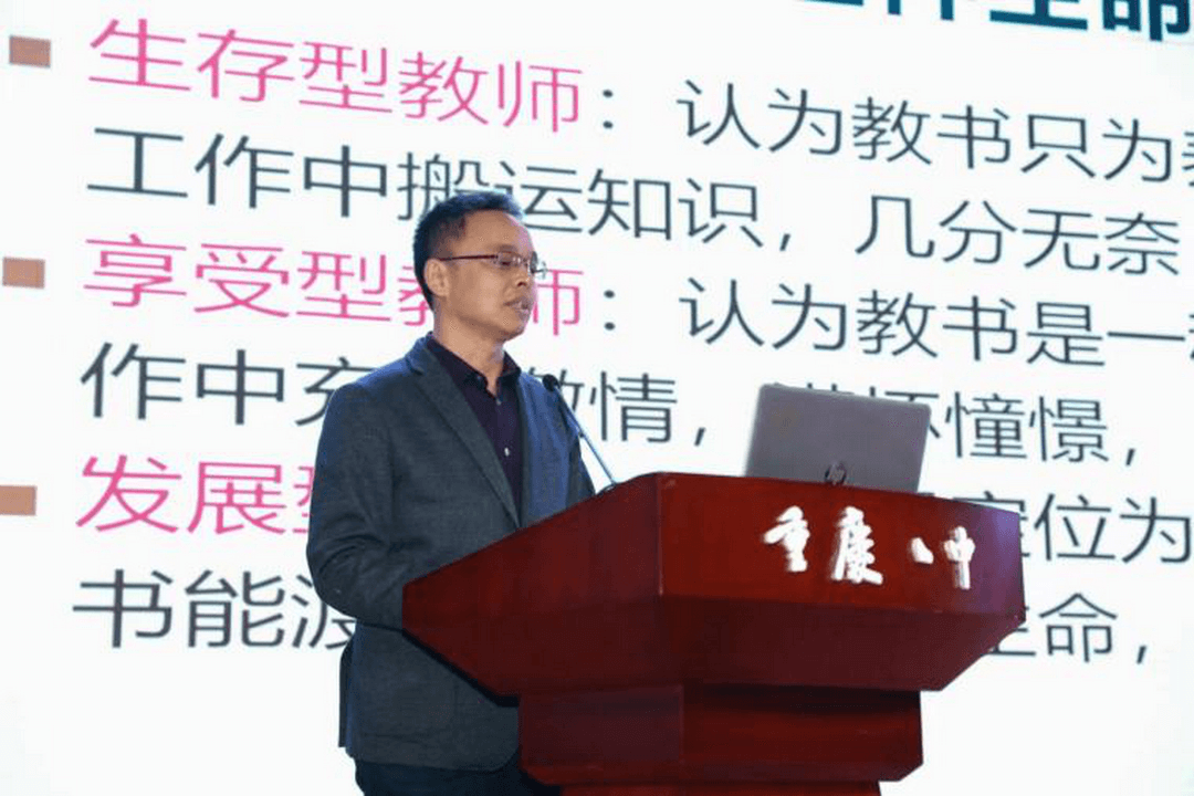 自主成长,努力攀登,才会有教师生命质量的不断提升。重庆八中正高级语文教师、渝北区语文学科带头人、语文学科专家王刚老师结合自己的成长经历,以“托起专业发展的三个支点——做一个发展型教师”为主题进行经验交流。王老师认为,探寻生命意义,实现人生价值,是教师专业成长最强大的内驱力。在成长路径上,王老师总结了三大支点,即“读书”“读人”“乐研”。学习、实践、反思、研究则是专业成长中不可或缺的四种行为。王老师在教学研究上硕果累累,笔耕不辍,这离不开他对教育赤子般的热爱,在涵咏玩索中当自有见。