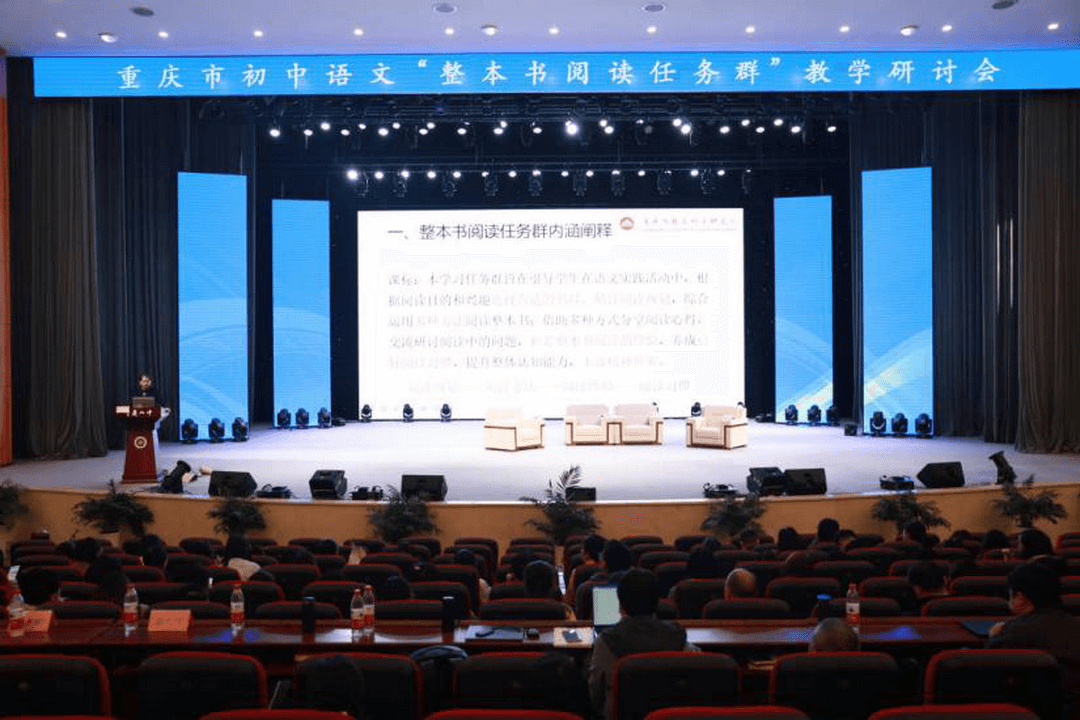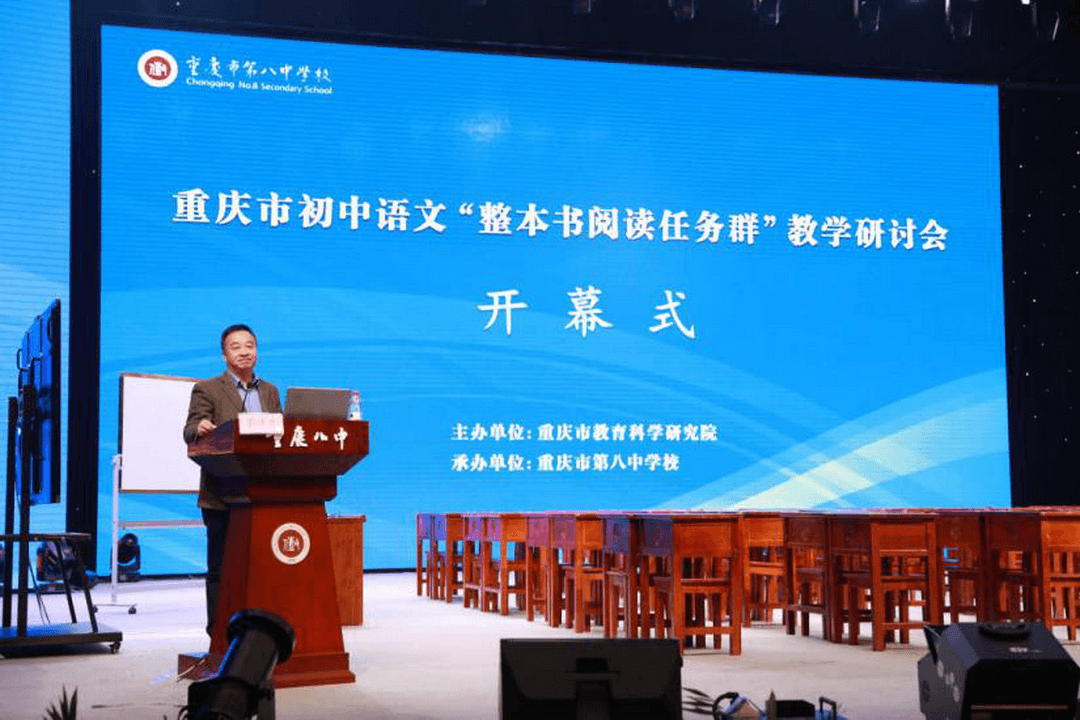 为全面落实新课标任务群理念,探索整本书阅读教学策略,提升整本书阅读教学质量,3月17日上午,重庆市初中语文“整本书阅读任务群”教学研讨会在重庆市第八中学校渝北校区艺术馆隆重举行。本次活动由重庆市教育科学研究院主办,重庆市第八中学校承办。重庆市教科院初中语文教研员陈家尧、重庆八中副校长张泽勇、重庆市各区县教研员及教师代表共800余人参加了本次活动,活动由重庆八中高中语文教研组长秦久传老师主持。