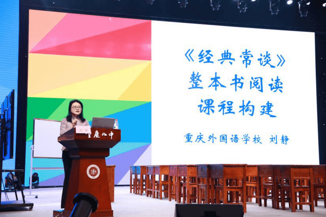 在研讨会现场,重庆外国语学校的刘静老师从“《经典常谈》整本书课程构建”的宏观维度出发,结合教学实际谈到《经典常谈》的教学目标设定、教学阶段课程阐述、教学任务驱动设计等问题,让人豁然开朗。