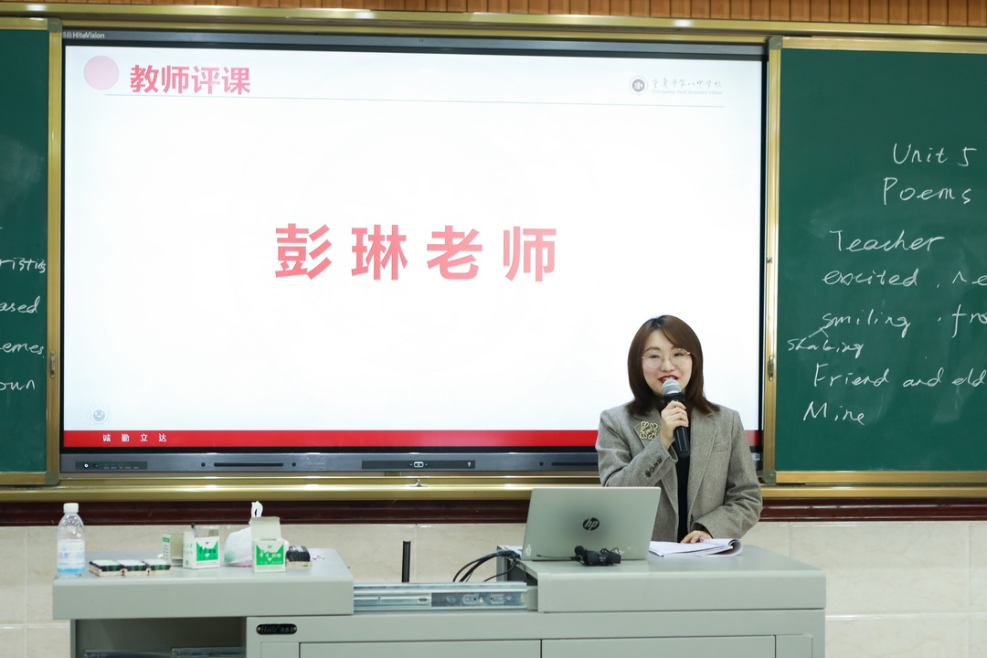 陈可老师用“用心”和“用情”两个词形容了三位老师的课,并用“人美,语言美,课堂美”高度评价了三位老师的英语课堂。胡亚老师的课十分紧凑,且合理地把握了重难点,成功完成了四个教学目标,充分传达了核心素养的要求。听后活动紧扣时代背景和时代人物,传达正能量,调动学生积极性,是一堂“重过程,重发现,重生活,重主体”的课。杨老师的课以文化意识为驱动,引导学生提升语言能力、学习能力,打磨思维品质。整堂课体现了“教师主导,学生主体”和“教学评一体化”的教学理念,课堂活动高效,小组竞争激烈。赵老师的课关注语言本身,导入新颖,支架搭建完善,产出效果非常好。整节课强调“模仿”,促进学生在模仿中巩固所学知识,在模仿中体会诗歌的美。最后的颁奖仪式真正做到了表扬不同层面的学生,很好地激发了学生的学习动力。