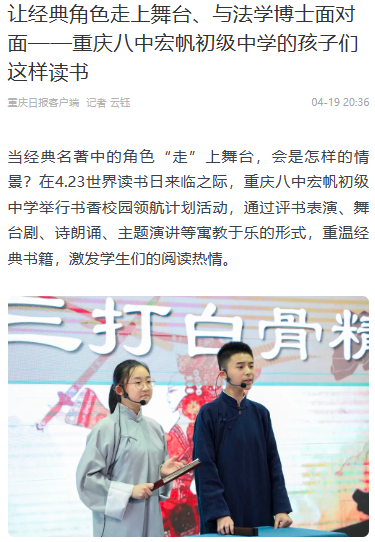 当经典名著中的角色“走”上舞台,会是怎样的情景?在4.23世界读书日来临之际,重庆八中宏帆初级中学举行书香校园领航计划活动,通过评书表演、舞台剧、诗朗诵、主题演讲等寓教于乐的形式,重温经典书籍,激发学生们的阅读热情。