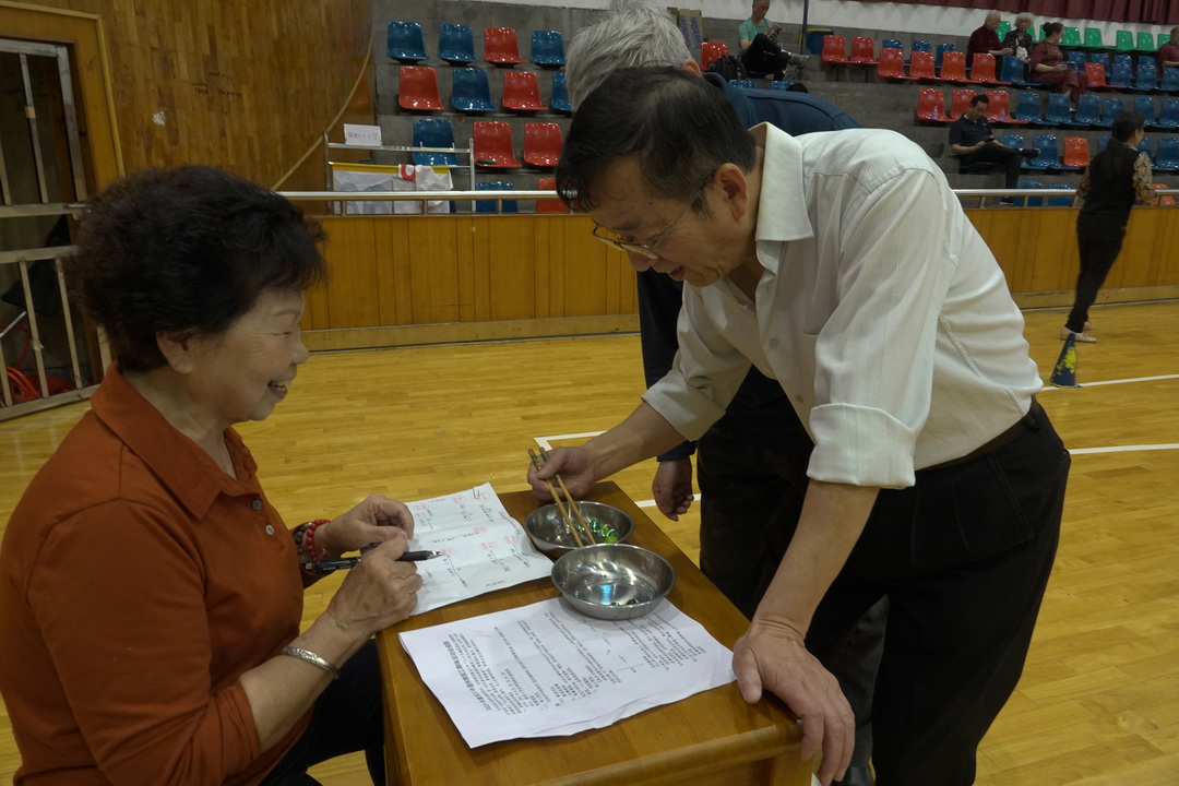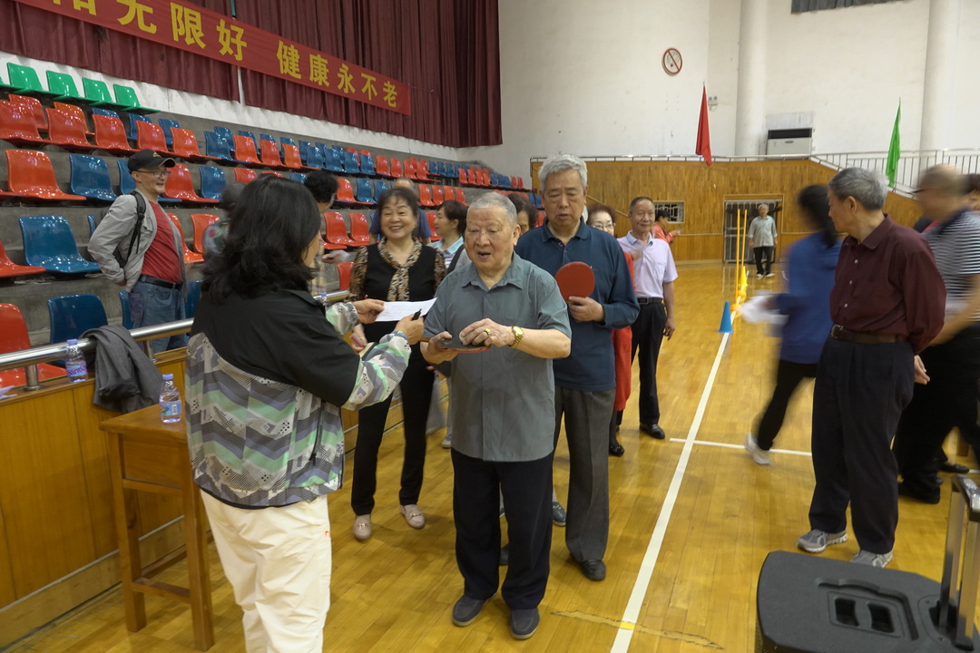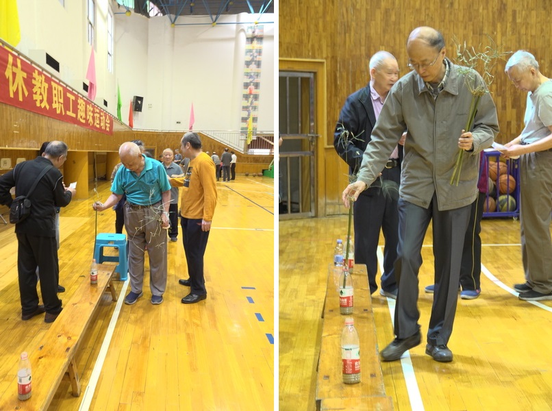 运动会设置了团体项目:投篮计数比赛,个人项目:托乒乓球绕杆、蛙跳凤池、插花、舀硬币、运输弹珠、开锁、套圈等。参加运动会的老同志近百人,年龄最大的已89岁,年龄最小的55。