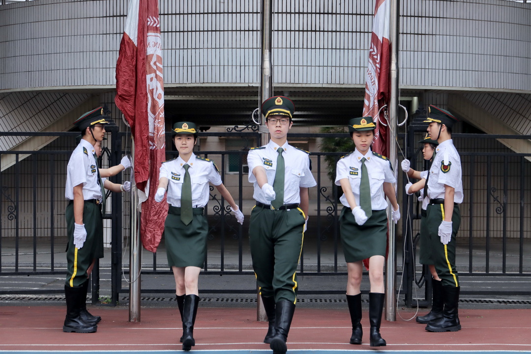 迎着朝阳,国旗仪仗队的升旗手们护卫着鲜艳的五星红旗入场,他们着装整齐、步伐矫健。随着《义勇军进行曲》响起,全体师生齐唱国歌,行注目礼。随后升校旗,全体师生唱响校歌。