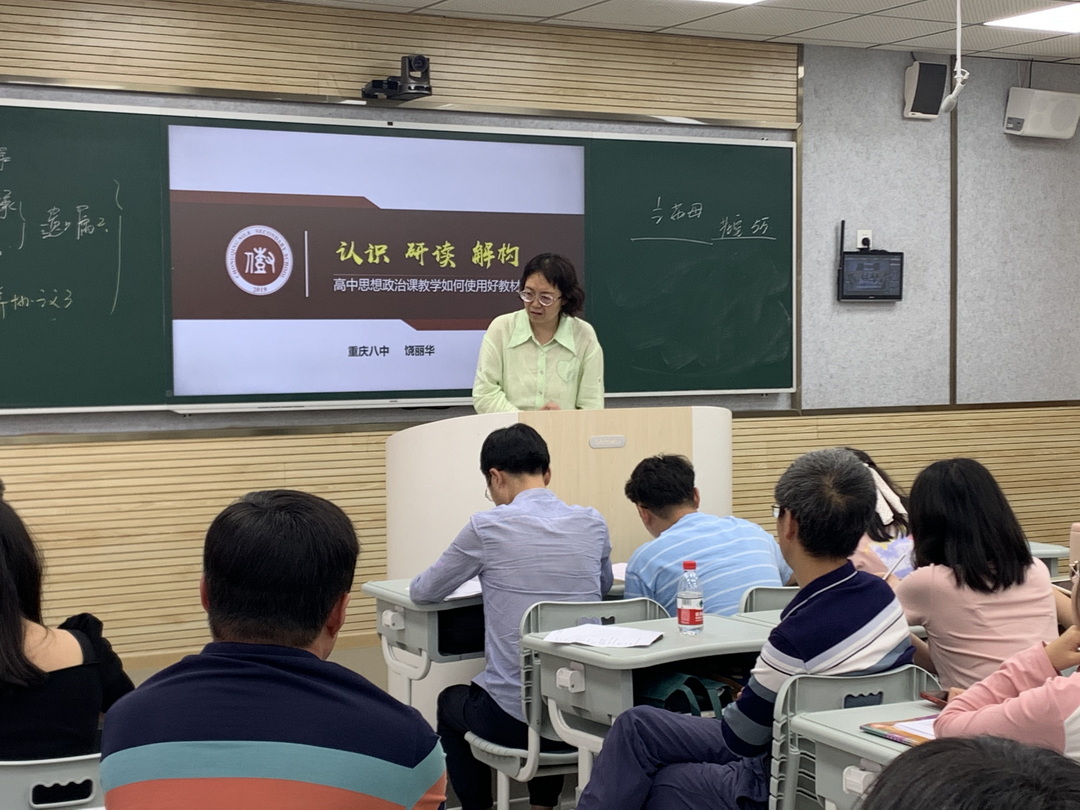 2023年6月1日,重庆八中2022—2023学年(下)“名师论坛暨精品课”活动(高中思想政治专场)在沙坪坝校区阶梯教室五举行并云校同步直播。沙坪坝校区高二思想政治备课组组长、教学名师饶丽华老师带来精品课——《薪火相传有继承》以及专题讲座——《认识,研读,解构》。我校初高中全体思想政治教师参加此次线下活动,重庆八中党委书记卿知人老师、教科室鄢斌老师莅临指导。