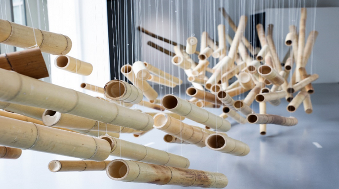 《上川下川》是艺术家刘俐蕴从嘉陵江获得的灵感,长长短短的的竹子组成船筏之貌,在展厅内悬挂,又好似巨型的风铃,川江号子高亢激越的声音,在空旷的展厅内回荡,将观展者的思绪引到江河纵横的巴蜀境内。