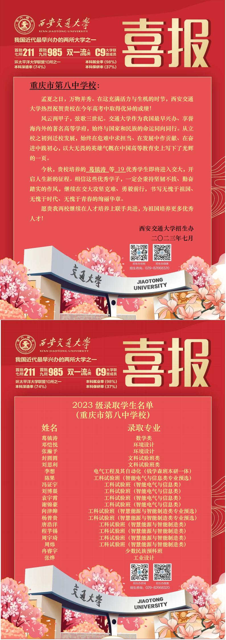向我校发来喜报,恭喜我校高2023级19位优秀毕业学子被西安交通大学录取。