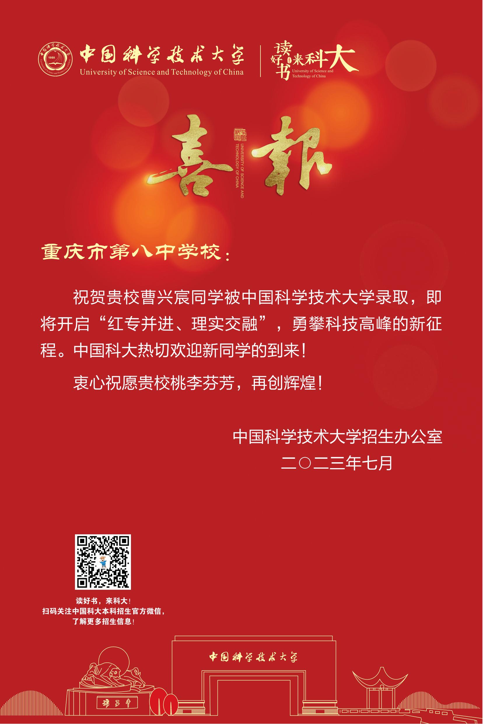 向我校发来喜报,恭喜我校高2023级1位优秀毕业学子被中国科技大学录取。