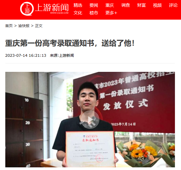 上游新闻——重庆第一份高考录取通知书,送给了他!