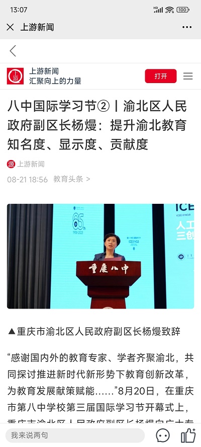 上游新闻客户端——八中国际学习节②丨渝北区人民政府副区长杨熳:提升渝北教育知名度、显示度、贡献度