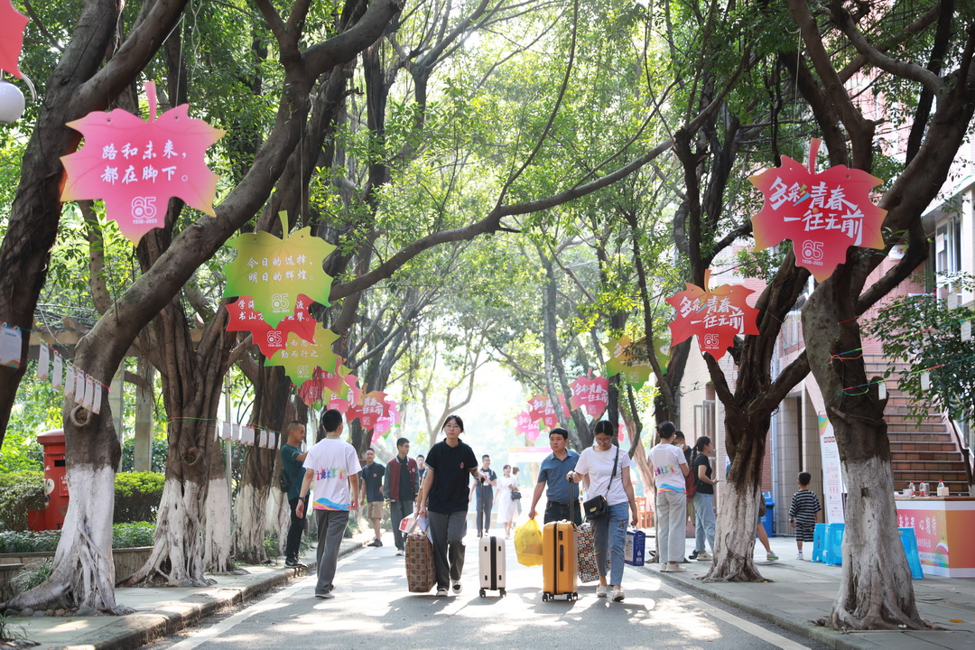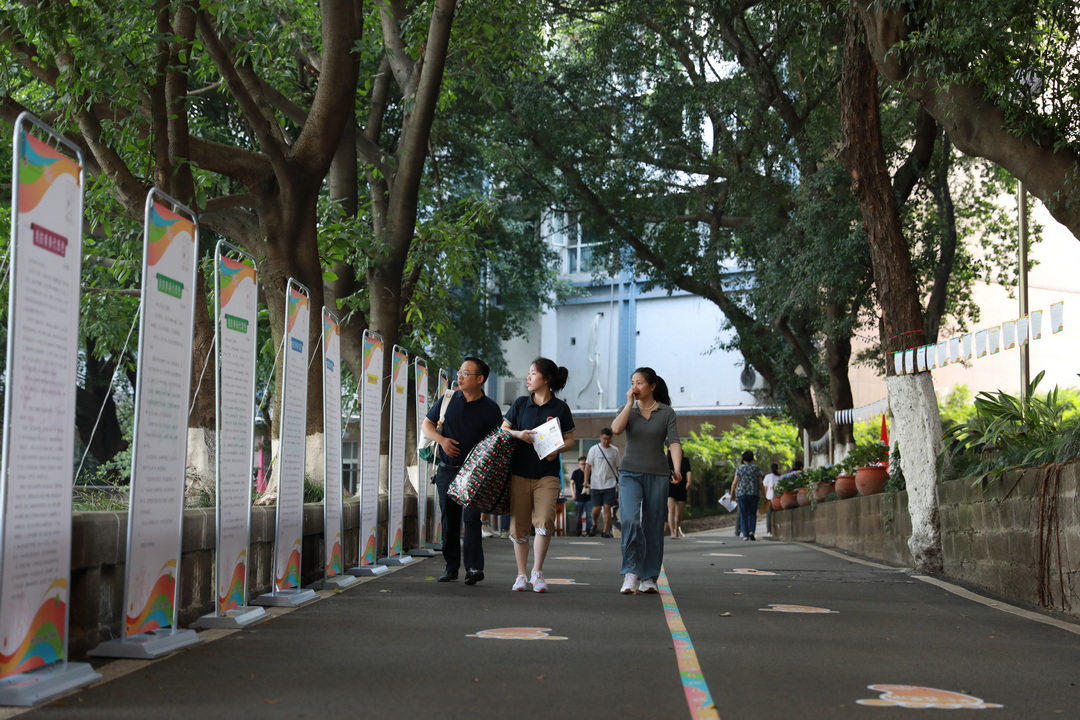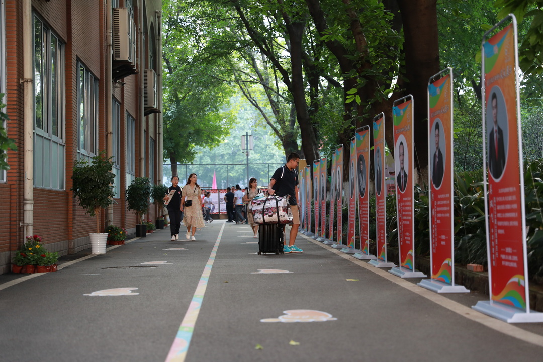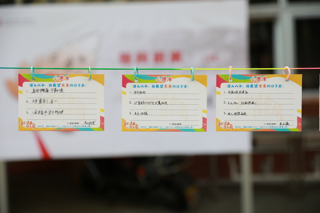 校园里,正门口放置有签名墙,供新生与家长合影留念;道路中间贴有路线指引,道路两旁分别展示有新高一班主任团队介绍牌、刚毕业的优秀学长学姐写给新同学的信;此外,校园各角落还有五处志愿者服务点,三处照相打卡点……另外,为提高迎新活动的互动性,食堂门口还专门设有心愿卡填写处,新生参与活动收集齐“诚勤立达”卡片还可以兑换精美书签奖品。