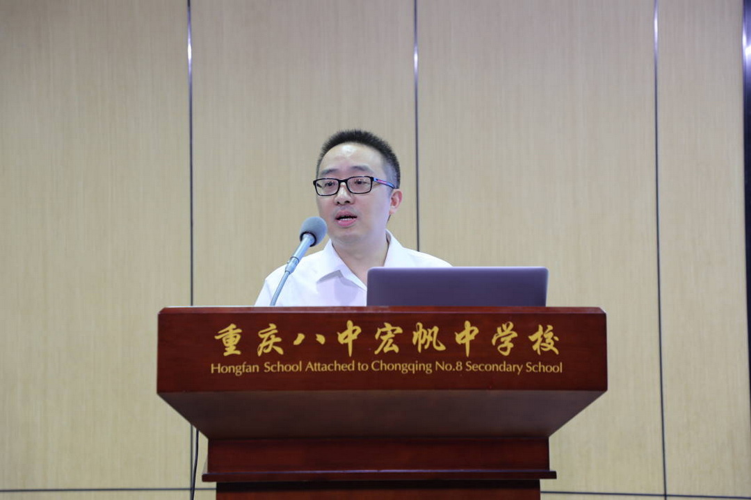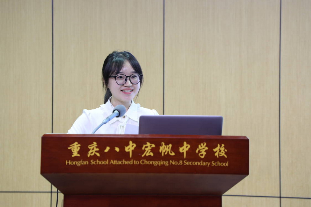 重庆学科名师、中学语文正高级教师安民老师作为指导教师代表发言。安民老师的发言功深熔琢、气无烟火,他平静而深情地回顾了他初上讲台时的指导教师——特级教师、全国优秀语文教师陈秉文老师对他的殷殷教导。安老师以鲜活生动的事例讲述了陈秉文老师“严谨”、“质朴”与“优化创新”的杰出职业品质和道德修养,他认为“师父领进门,修行在两人”,期待与青年教师共同增长学科素养,增进人生修为。安老师在繁忙的工作中担任了五名新入职教师的指导老师,也正生动体现了他甘为人梯的教育情怀。数学组严元苑老师作为青年教师代表发言。她讲述了自己作为八中宏帆中学曾经的学子如今站上母校讲台、又拜在曾经的数学老师席下继续学习的珍贵缘分,分享了自己在师父指导下的点滴成长,表示将会虚心学习、加快成长。