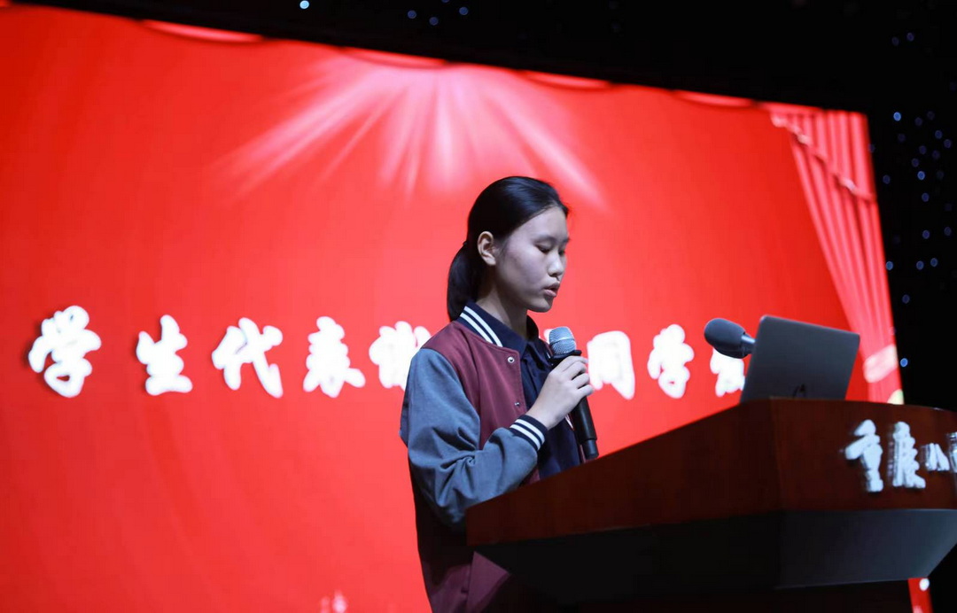 高2024级1班谢卓航同学作为优秀学生代表讲话。“求木之长者必固其根本,欲流之远者必浚其源”,谢卓航同学认为扎实基础对于学习成绩的提高有着至关重要的作用。把握课堂与作业的质量是夯实基础的重要方法。在课堂上,同学们要通过动笔记笔记、动口答问题、动耳听讲解、动脑思考问题等方式积极参与到课堂中,成为课堂的主人、学习的主人。在对待作业上,同学们既要注意速度,不拖延,善规划,也要注重作业的质量。在完成作业后进行适时的总结、归纳、反思、复习是提高作业质量的保障。只有平时如“战”时,才能做到“战”时如平时,以从容淡定的心态迎接每一场考试。