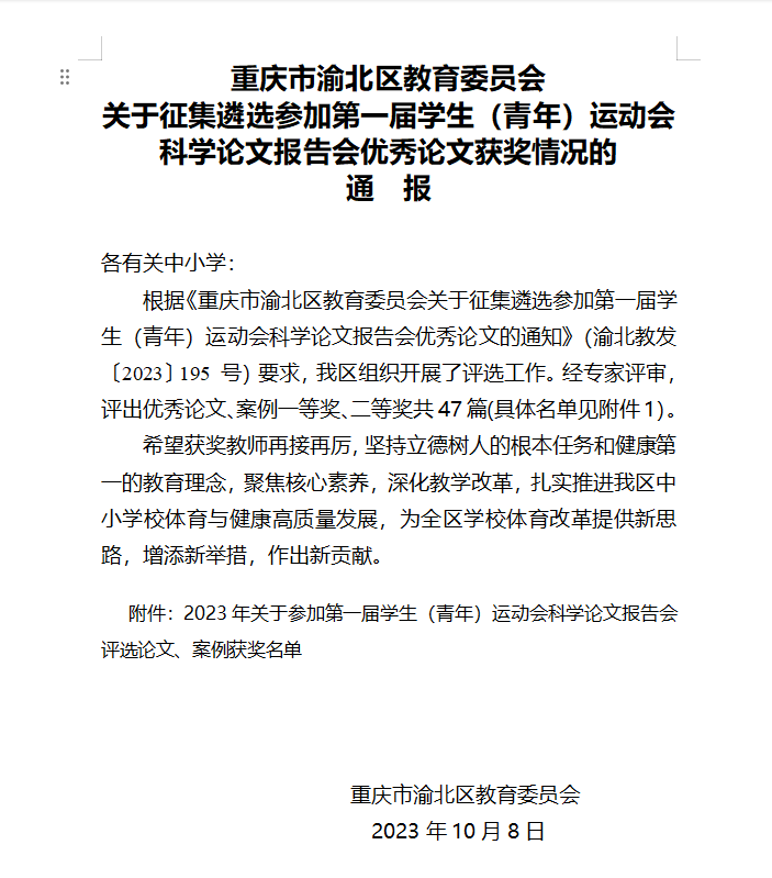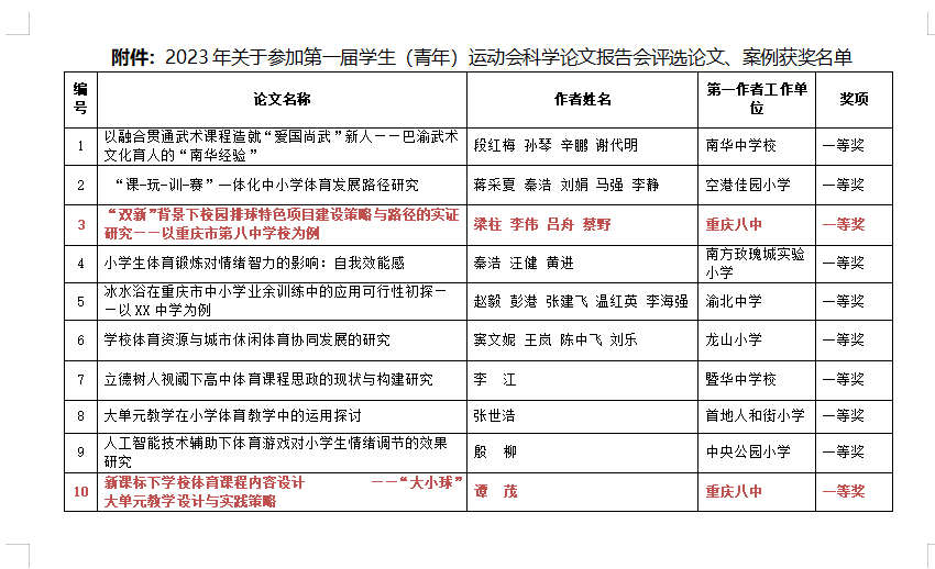 在刚刚结束的重庆市渝北区教育委员会关于征集遴选参加第一届学生青年运动会科学论文报告会优秀论文评选活动中,重庆八中体育教师梁柱、吕舟、李伟、蔡野、明小利、谭茂撰写的论文分别获得一等奖,即将被渝北区推往重庆市参加市级评选。预祝以上教师在市级评选中再次斩获佳绩。