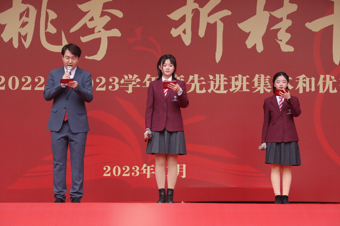 在过去的一年中,学校涌现出一批表现突出、成绩显著的先进集体和个人,经各班、各年级民主推荐、学校审核,重庆八中党委书记卿知人老师代表学校对这些先进个人和集体提出表扬决定:决定授予高一19班李雨柯、高一20班黄翔等20人“2023年高一综合素质奖”,授予高二29班王冠云、高三14班朱炫羽等62人“进步学生”称号,授予高二18班翁诗语、高三15班谢佳治等352人“优秀学生”称号,授予高二22班张恩泽、高三27班李锦浪等95人“优秀学生干部”称号,授予高一26班徐成蹊、高二25班刘曼如、高三26班王尧等24人“熊榆争光奖”,授予高二17班陈昭汝、高三16班刘鑫宇等20人“八中之星”称号,授予高二17班19班20班22班、高三23班24班26班27班“先进班集体”称号。随后,学校领导和家长代表纷纷上台为获奖师生代表颁奖。大会最后,高二20班的同学朗诵诗篇《有我》,献给母校八中,也献给一代代不负时代重托的中国青年。