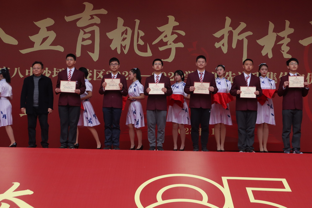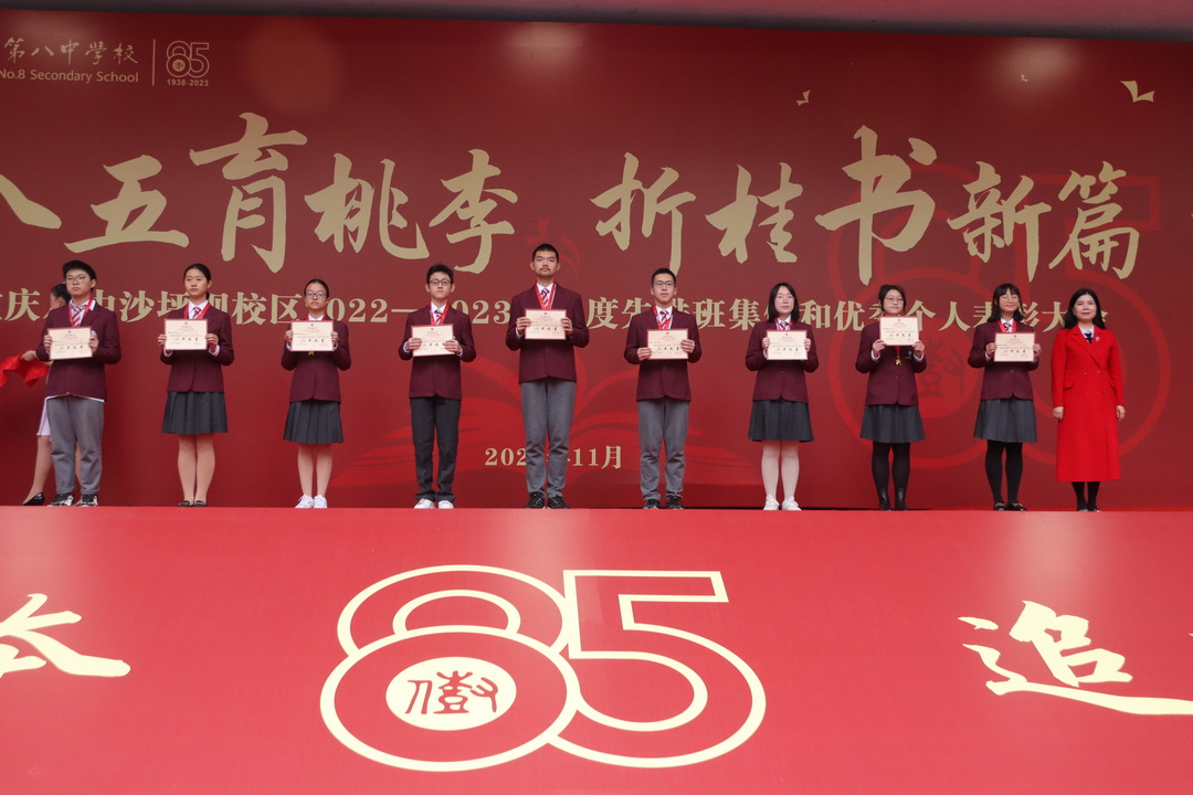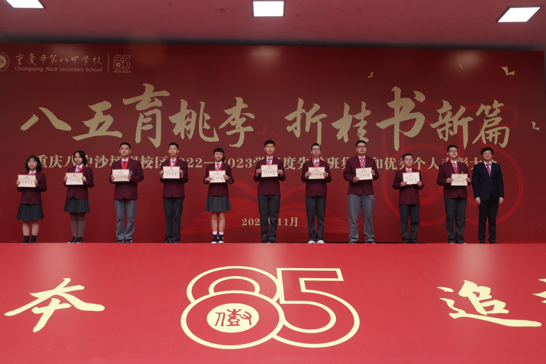为庆祝重庆八中八十五周年校庆,赓续八中表扬优秀、树立典型的历史传统,激励全体八中学子砥砺创新、再创辉煌,重庆八中沙坪坝校区于11月14日在操场举行了“重庆八中2022-2023学年度先进班集体和优秀个人表彰大会”。本次大会由杨振巍老师、高一17班吴姝瑶、高一23班李明格共同主持,邀请了重庆八中党委书记卿知人老师、副校长付英老师、副校长梅家烨老师、副校长曾奇老师等领导和部分家长代表们出席了本次活动。