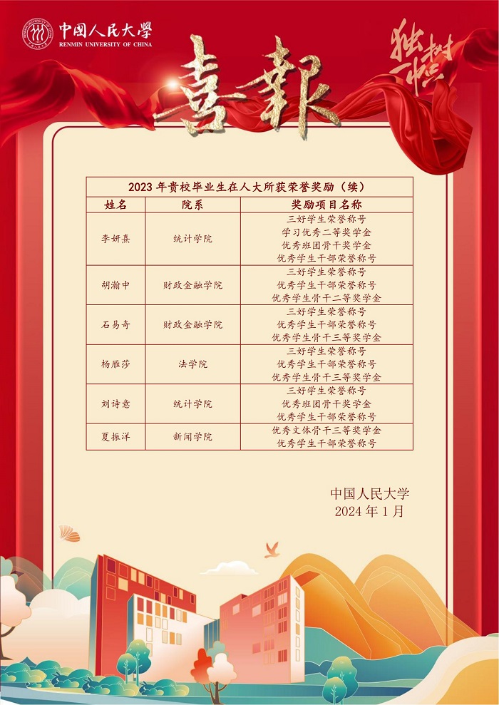 中国人民大学发来喜报:2023 年,我校毕业生在我校勤学笃志、砥砺品格、锤炼本领,取得了优异成绩。特此报喜,并致以诚挚感谢与热烈祝贺!未来,让我们继续携手并进,共同为中国式现代化培养更多治国理政、经世济民、学术领军、全球治理等领域的栋梁之才