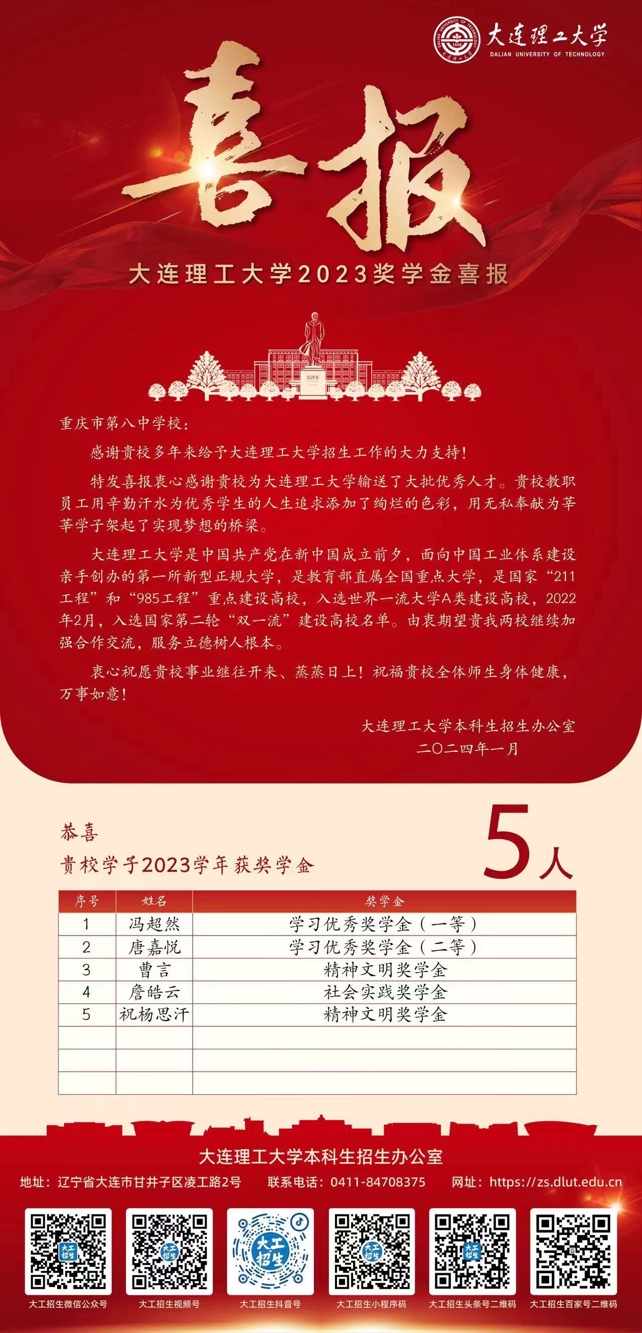 大连理工大学发来喜报感谢我校为大连理工大学输送了大批优秀人才。我校教职员工用辛勤汗水为优秀学生的人生追求添加了绚烂的色彩,用无私奉献为莘莘学子架起了实现梦想的桥梁。