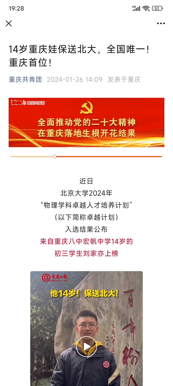 重庆共青团——14岁重庆娃保送北大,全国唯一!重庆首位!