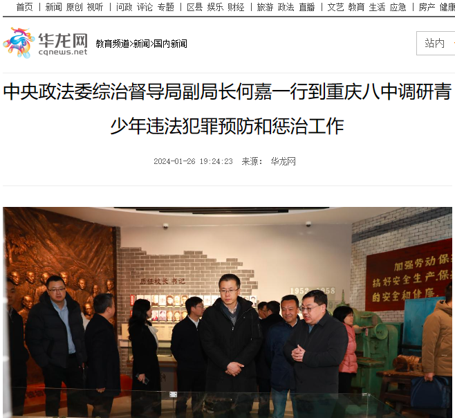 华龙网讯(郭晓彤)1月23日,中央政法委综治督导局副局长何嘉一行到重庆八中调研青少年违法犯罪的预防和惩治工作,以及学校管理教育工作开展情况、家庭监护教育责任落实情况等。市委政法委副书记、市未联办主任张强,市委教育工委委员、市教委总督学吴边,渝北区委常委、政法委书记颜其勇,市委政法委、市教委、渝北区教委等有关领导和部门负责人,以及重庆八中党委书记卿知人等校领导陪同调研。