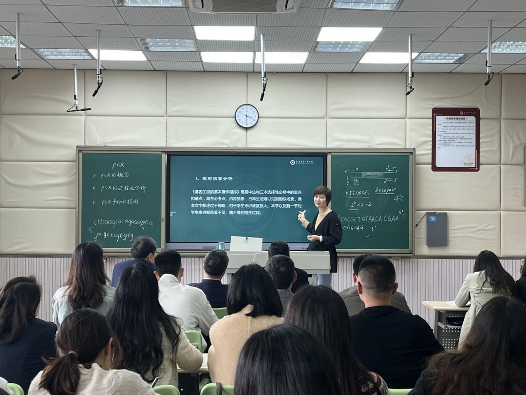 在精品课展示环节,王敬文老师以“基因工程的基本操作程序”为主题,聚焦PCR技术,适当融合大学知识,呈现了一堂精彩绝伦的生物课。整堂课条理清晰,重点突出,关注学生学情与实时反馈,充分体现了跨学段融合教育特点。在教学内容上,王老师注重新旧知识的结合,将人教版普通高中教科书《生物学》必修二与选择性必修三的知识紧密联系,实现温故知新,此外还将大学或者研究生阶段的DNA半不连续复制、PCR仪的使用方法、DNA琼脂糖凝胶电泳法的具体原理等内容融合进入课堂,帮助学生透彻理解PCR技术的相关过程;教学过程中,王老师注重调动学生能动性,如给出真实基因序列请学生自行设计引物,并在此基础上自然生成课堂知识点——引物设计的注意事项,此外王老师还巧妙结合视频图片,帮助学生理解抽象微观的PCR技术;教学设计上,王老师注重对学生生物学情怀的引领,如通过分享PCR技术发明者获得诺贝尔奖的事例,让学生了解重要技术的突破对于生物学发展和人类生活的颠覆性影响,激发学生对于生物学的兴趣。