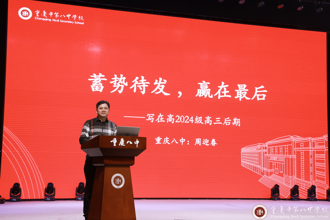 2024年4月14日晚,渝北校区高2024级举行了高三后期复习备考学生动员大会。重庆八中党委书记,重庆八中教育集团总校长周迎春老师,在大会上作了题为《蓄势待发,赢在最后》的精彩讲话,年级党支部书记安秋萍老师主持了这次大会。