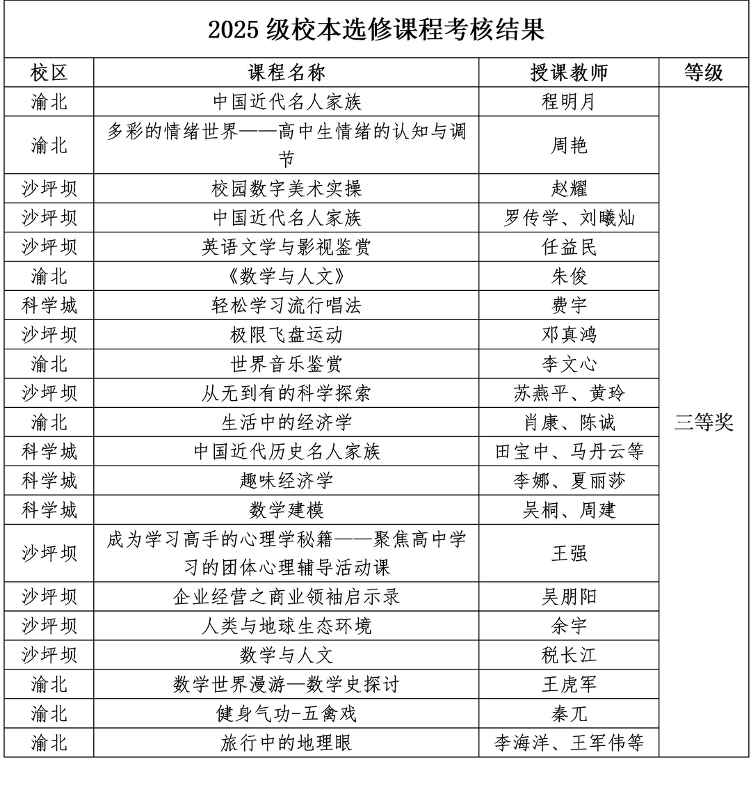 我校2023-2024学年度高2025级校本选修课程评选结果已揭晓。共42门课程参与评选,基于公平、公正的原则,经专家评委团队认真评选,《中国古代笔记小说选读》等8门课程荣获一等奖,《指尖上的生物学》等12门课程荣获二等奖,《校园数字美术实操》等21门课程荣获三等奖。